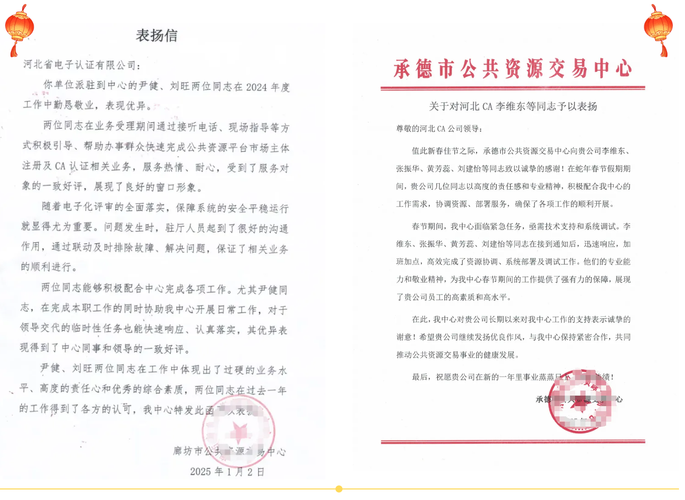 “勤懇敬業,服務熱情”,這是來自廊坊市公共資源交易中心送來的表揚信上的話語。尹健、劉旺兩位同志在業務受理期間通過接聽電話、現場指導等方式積極引導、幫助辦事群眾快速完成公共資源平臺市場主體注冊及CA認證相關業務,服務熱情、耐心,受到了服務對象的一致好評,展現了良好的窗口形象。承德市公共資源交易中心同樣送來了表彰,“劉建怡、張振華、李維東、黃芳蕊等同志細致入微的堅守為我中心春節期間的工作提供了強有力的保障,展現了貴公司員工的高素質和高水平。”正是這份“急客戶之所急,解客戶之所難”的初心,讓我們收獲了這份沉甸甸的認可。