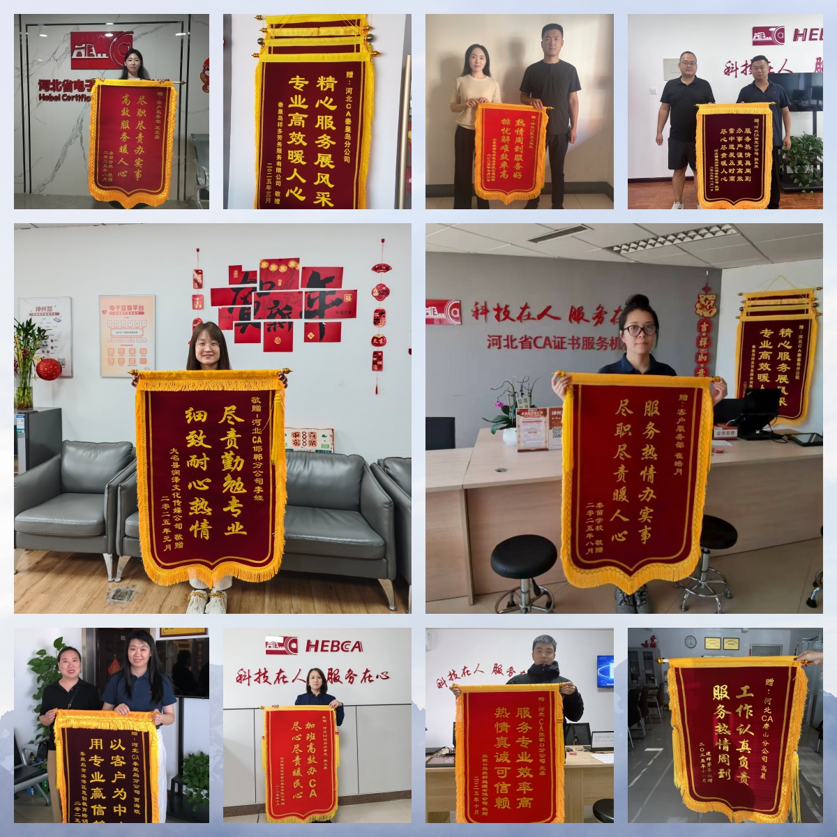 除了政務、醫療領域,來自企業和個人用戶的認可也從未間斷。我司眾多服務人員始終把客戶需求放在首位,甘愿犧牲個人休息時間,即便到了深夜十點多,仍會為有緊急需求的用戶答疑解惑、加急辦理業務,周末假期也常能看到大家到崗辦公的身影,竭盡所能為用戶解決認證難題。證書管理部李哲連夜趕到公司等候客戶辦理 CA、唐山分公司王琪、呼叫中心馮博倫、廊坊分公司尹健利用假期加班指導申請并制作招投標證書,正是這份堅守的生動縮影。有小微企業主在表揚信中寫道:“河北CA的服務太貼心了,從證書辦理到后續維護,全程指導,通俗易懂,解決了我們不懂技術的難題”;有個人用戶特意送來錦旗,感謝我們的服務人員耐心解答疑問,高效辦理業務,省去了來回奔波的麻煩。