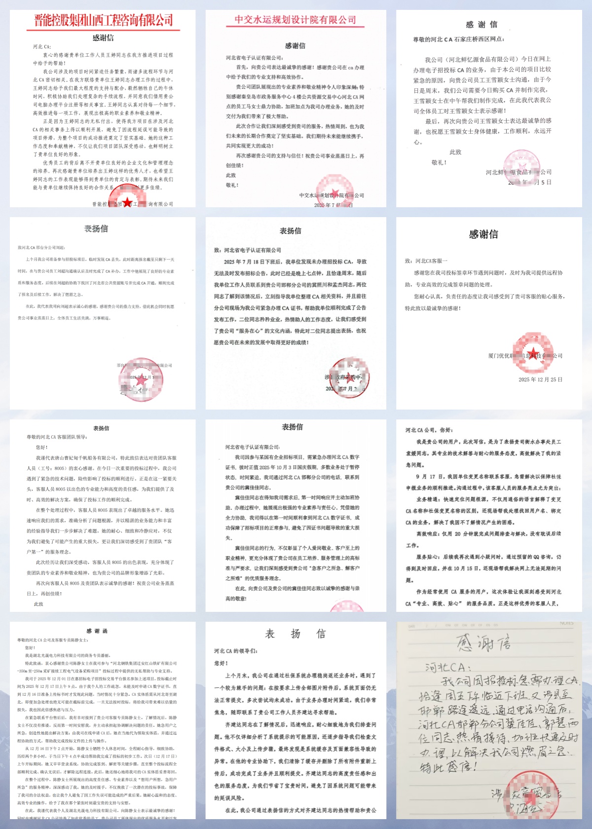 回望2025年,對于河北CA而言,是深耕服務、收獲認可的一年,更是與每一位客戶雙向奔赴、共赴成長的一年。這一年里,我們的辦公桌上,漸漸堆滿了來自四面八方的驚喜——40余封飽含深情的表揚信、10余面熠熠生輝的錦旗,它們來自公共資源領域、醫院機構的合作伙伴,來自深耕實業的大小企業,也來自信賴我們的每一位個人用戶,每一面錦旗、每一行字跡,都是對河北CA服務最真摯的肯定,更是我們前行路上最珍貴的動力。